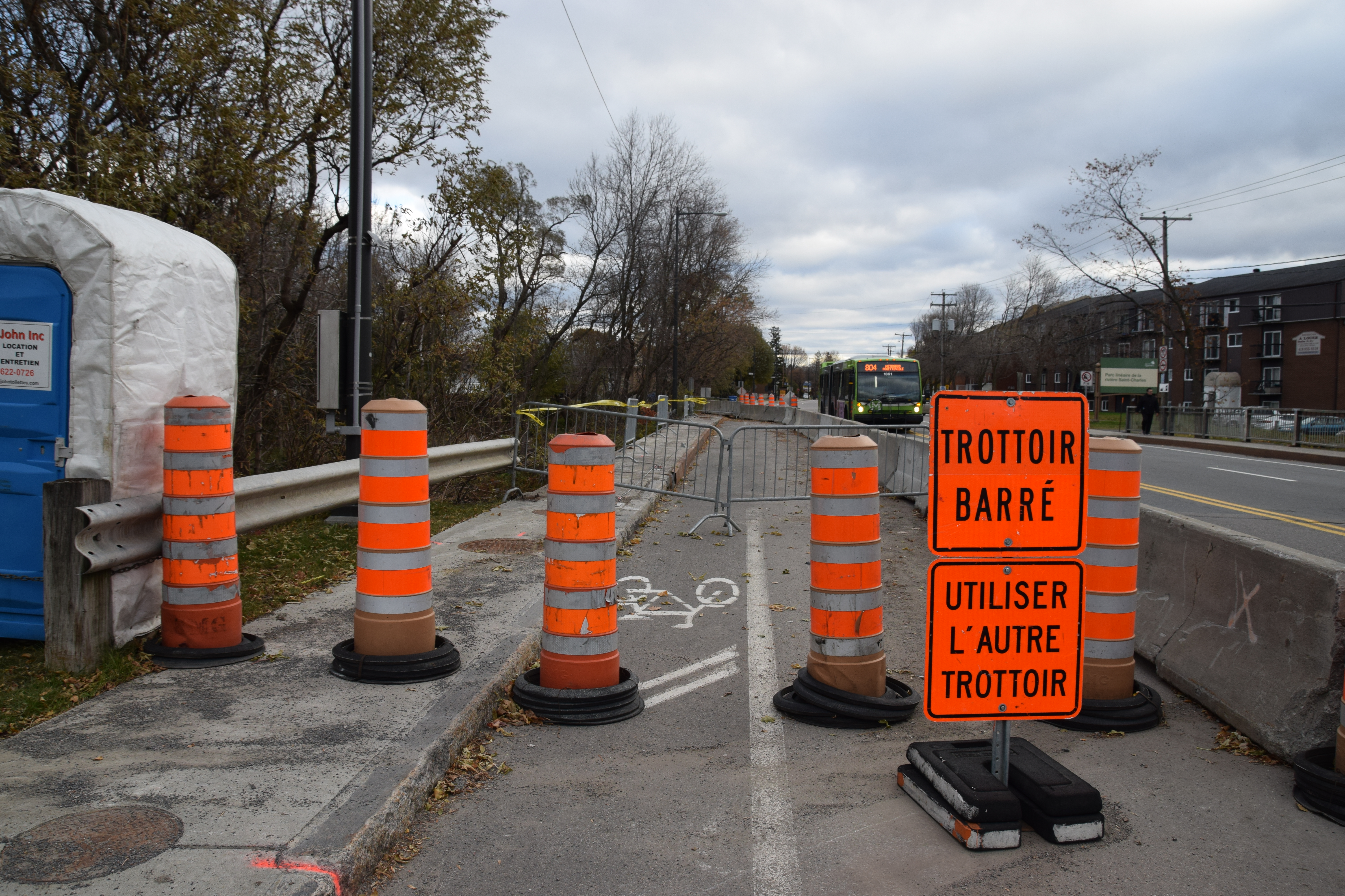 Des travaux sont en cours sur le ponceau surplombant la rivière Saint-Charles sur le boulevard Père-Lelièvre et se poursuivront jusqu’à la fin décembre. Ils reprendront ensuite le printemps prochain pour une durée d’environ deux mois. La barrière du côté nord a été enlevée forçant la fermeture du trottoir. On effectue divers travaux de réparation et d’entretien de la structure.