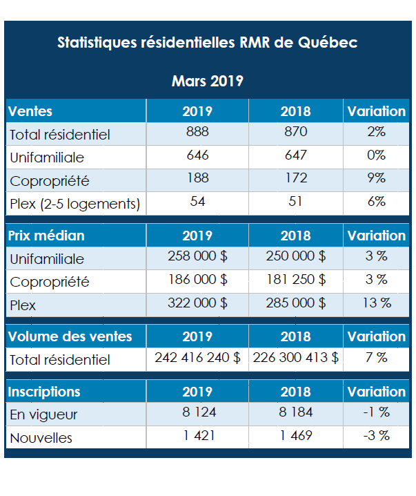 STATISTIQUES. Les reventes résidentielles ont progressé légèrement en mars dans la région de Québec. Un total de 888 transactions a été enregistré, soit une hausse de 2% par rapport au même mois en 2018.