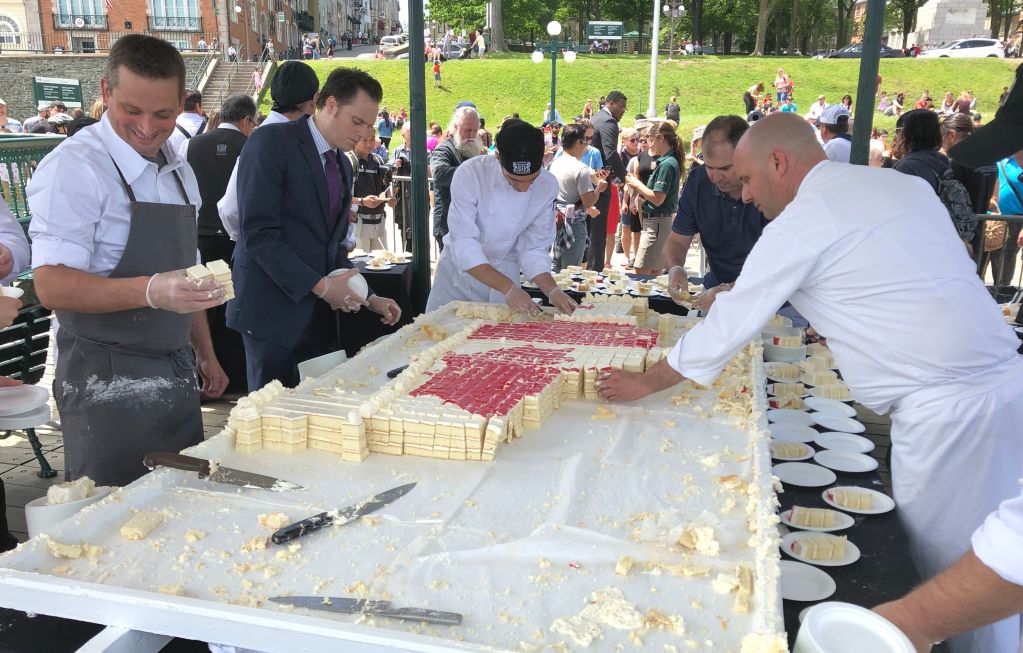 Pour la petite histoire, l’immense dessert à l’effigie du drapeau canadien a été concocté par Frédéric Cyr, directeur culinaire du Château, et sa brigade en cuisine. Sa réalisation a nécessité l’équivalent de 600 oeufs, 360 blancs d’oeufs, 110 livres de sucre, 50 livres de farine et 90 livres de beurre.