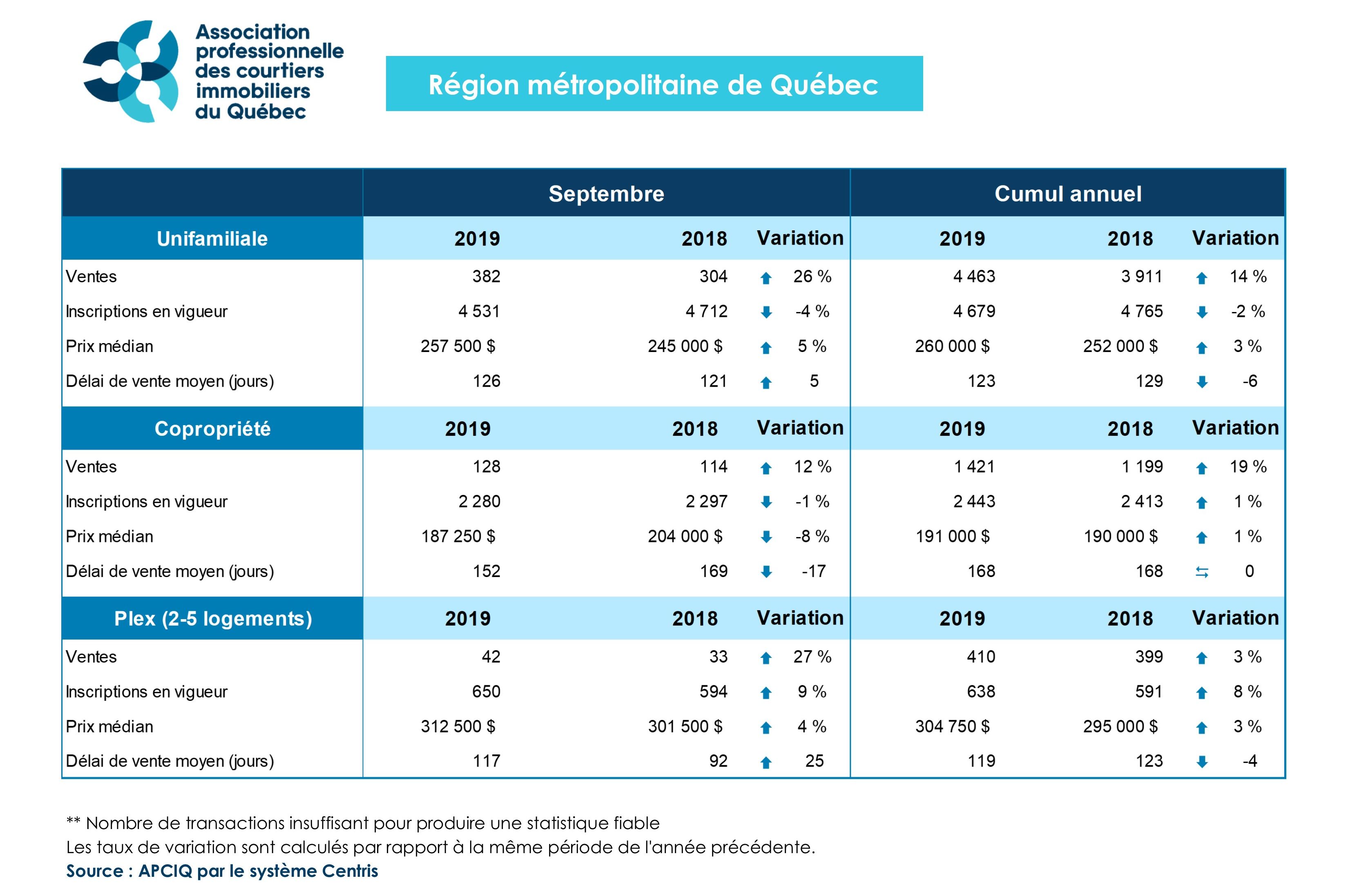 Selon l’APCIQ, la croissance des reventes dans les principaux secteurs résidentiels de la région de Québec a encore été vigoureuse par rapport à septembre 2018. L’agglomération de Québec a de nouveau surpris avec une forte hausse de ses transactions (+27%), soit 397 contrats signés.