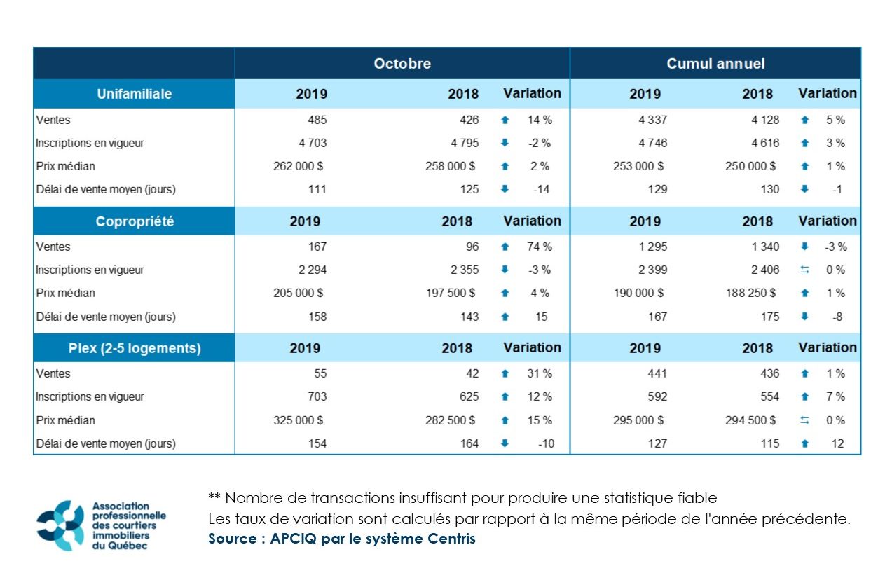Les reventes de maisons unifamiliales ont connu une solide progression (+14%) avec un niveau de transactions s’élevant à 485 unités. Au cours du mois, il fallait un délai de vente moyen de 111 jours pour vendre une propriété unifamiliale, soit 14 jours de moins qu’en octobre 2018, ce qui constitue une amélioration appréciable.