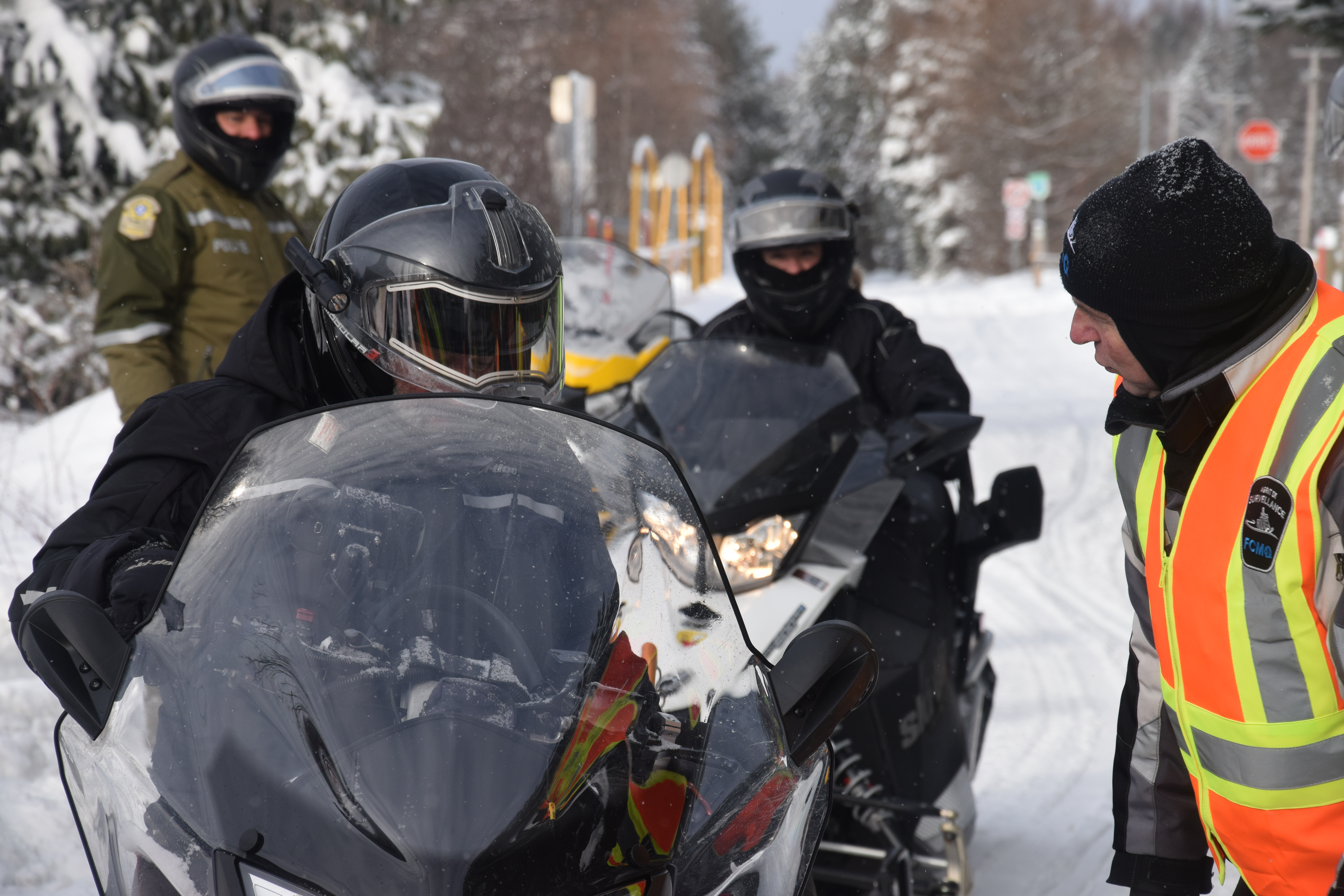 À l’occasion de la Semaine internationale de la motoneige qui déroule du 18 au 26 janvier, des représentants de la FCMQ et des agents de la Sûreté du Québec s’étaient donné rendez-vous le dimanche 19 janvier, à Saint-Raymond, afin d’installer un poste d’accueil en sentier pour interpeller les adeptes.