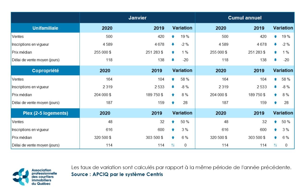 STATISTIQUES. Le premier bilan mensuel de l’Association professionnelle des courtiers immobiliers du Québec (APCIQ) révèle que l’année 2020 part sur de bonnes bases à Québec. Un total de 713 reventes ont été enregistrées au cours du mois de janvier. Cela représente une forte hausse de 28% par rapport au même mois de l’an dernier. Il s’agit d’un rythme qui s’inscrit dans la lignée de ce que nous observons depuis plusieurs mois.