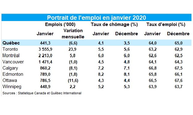 - Au Québec, les données révèlent que le nombre de personnes en emploi a subi une légère variation, affichant 200 emplois en moins entre les mois de décembre et de janvier. Quant au taux de chômage, il demeure à 5,3%.
