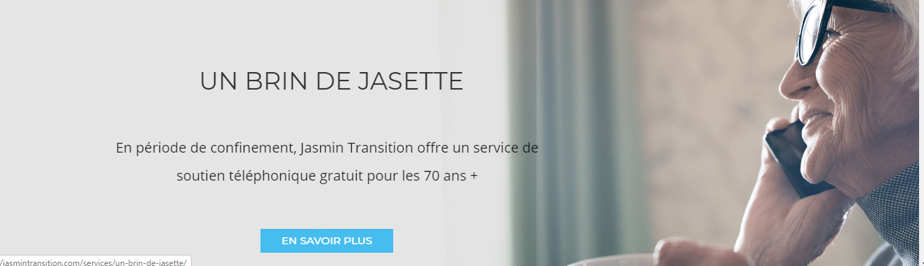 Jasmin Transition insiste pour dire que «UN BRIN DE JASETTE» ne propose pas de conseils spécialisés en santé. «C’est un service de support visant à écouter et à rassurer les personnes âgées. Je demeure convaincue de l’importance de rappeler aux plus vulnérables qu’ils ne sont pas seuls. Il faut qu’ils soient écoutés, entendus, en ces temps où la solidarité compte plus que tout», d’ajouter Danielle Jasmin.