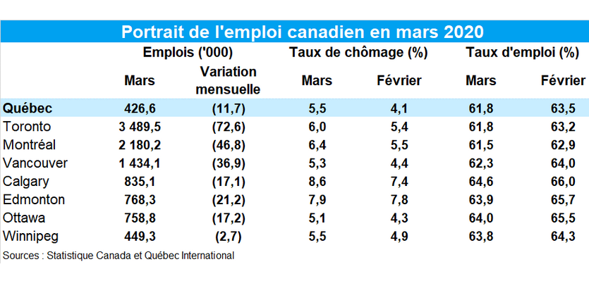 «Les données compilées par Statistique Canada en mars apportent un premier éclairage sur l’ampleur de la halte économique causée par la Covid-19. Toutefois, les prochains relevés du marché de l’emploi et l’évolution de la situation, au fil des prochains mois, permettront une meilleure compréhension des répercussions économiques qu’aura la crise», estime Émile Émond, économiste chez Québec International.