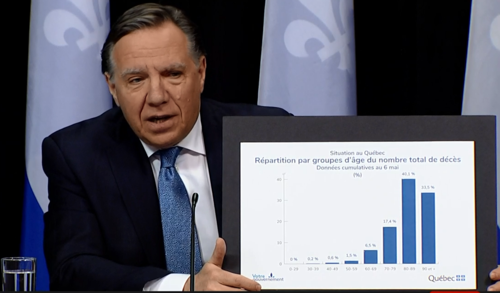 «91% des décès au Québec concernent les personnes âgées de plus de 70 ans. C’est pour cela que nous autorisons les gens de moins de 70 ans à retourner au travail et à pouvoir garder des enfants sous certaines conditions. Il n’y aura jamais de risque zéro et après deux mois de confinement il y a également des risques en santé mentale de garder les gens à la maison», mentionne le premier ministre.