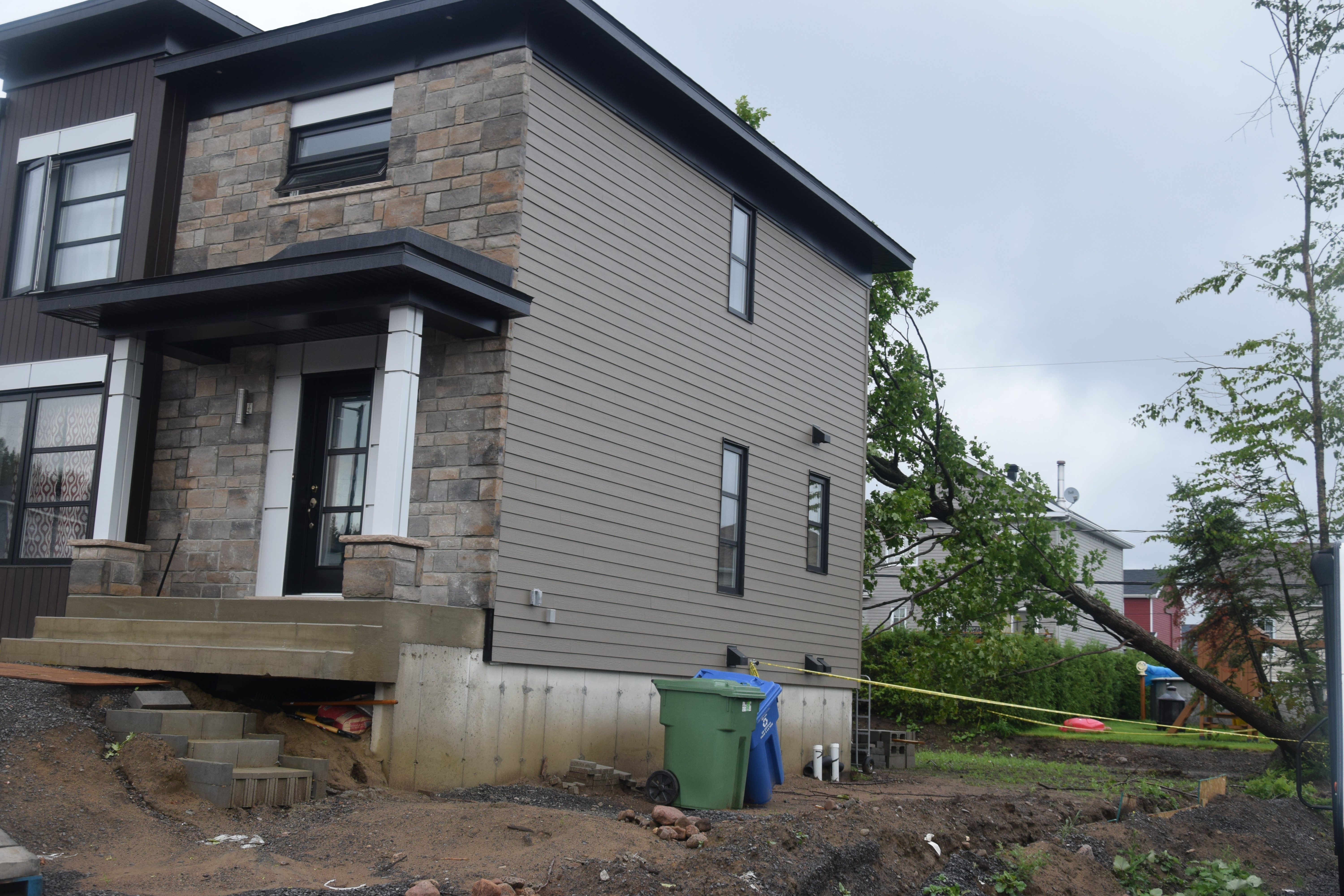 Vers 5h40, le central 9-1-1 a reçu un appel précisant qu’un arbre était tombé sur le toit d’une résidence neuve située au 1350 rue des Calèches, propriété de Construction C.R.D. de Québec.