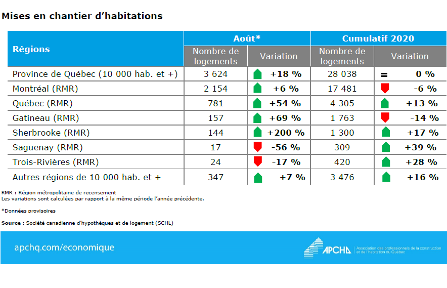 Sur le plan géographique, quatre centres urbains ont connu des hausses de leurs mises en chantier le mois dernier. Celui de Sherbrooke a notamment vu son nombre de mises en chantier tripler (+200%) comparativement à août 2019. Les autres régions ayant enregistré une croissance sont Gatineau (+69%), Québec (+54%) et Montréal (+6%). La nouvelle construction a toutefois fléchi du côté de Trois-Rivières (-17%) et de Saguenay (-56%).
