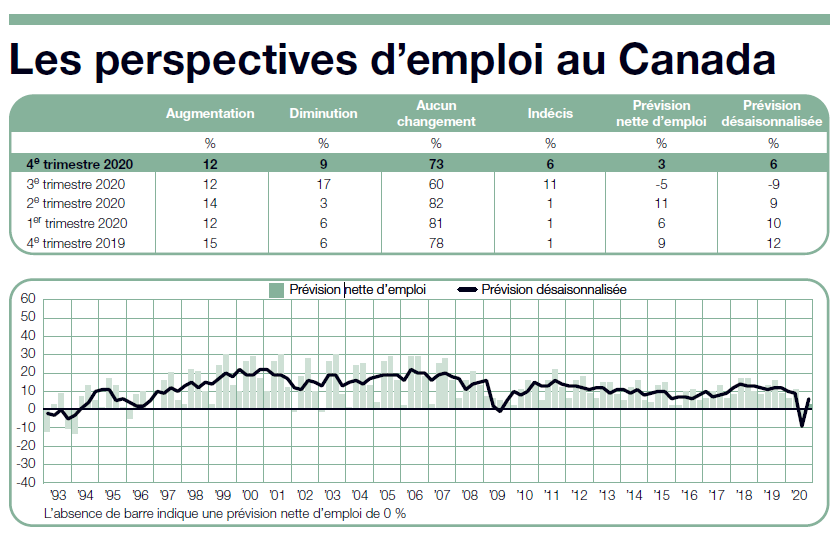 Bien que les projets de recrutement demeurent également modérés au pays, les prévisions démontrent une tendance à l’amélioration. Ainsi, les employeurs prévoient une augmentation de 6% des embauches au 4e trimestre de l’année en cours. Ce résultat représente un progrès de 15 points de pourcentage sur le 3e trimestre de 2020, mais aussi un recul de six points par rapport au 4e trimestre de 2019.