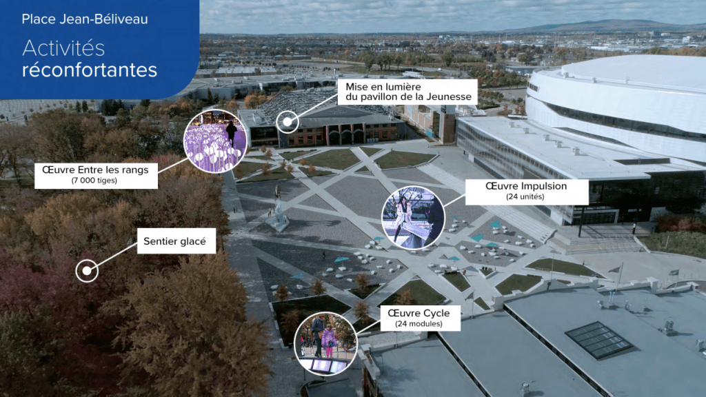 Enfin, Entre les rangs, déployés dans l’allée commémorative près du pavillon de la Jeunesse, est constitué de 7000 tiges souples et blanches qui prendront le pouls de l’espace urbain environnant. De plus, un sentier de glace, situé dans le secteur boisé de la place Jean-Béliveau, complétera l’offre dès que la température le permettra. Une station chaleureuse sera également aménagée à proximité pour le confort des visiteurs.