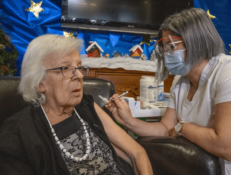 SANTÉ. Gisèle Lévesque, une femme de 89 ans résidant au Centre d’hébergement de soins longue durée (CHSLD) Saint-Antoine, est devenue à 11h25 aujourd’hui la première Canadienne vaccinée contre la COVID-19.