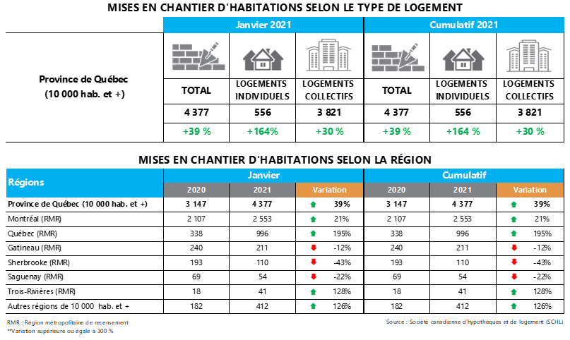 - 4377 habitations mises en chantier le mois dernier, soit une hausse de 39% par rapport à janvier 2020.