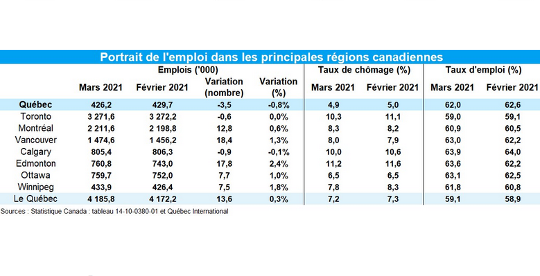 - Le taux de chômage a diminué à 4,9% en mars, la région détient le plus faible taux au Canada.