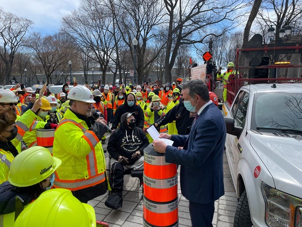 Le bruit des klaxons accompagnés des cris des manifestants, ont résonné jusqu’à l’intérieur de l’Assemblée nationale puisque l’ancien joueur de la ligue nationale de hockey, député de Marquette et porte-parole de la formation en transport, Enrico Ciccone, est sorti livrer un message de solidarité aux signaleurs routiers du Québec.