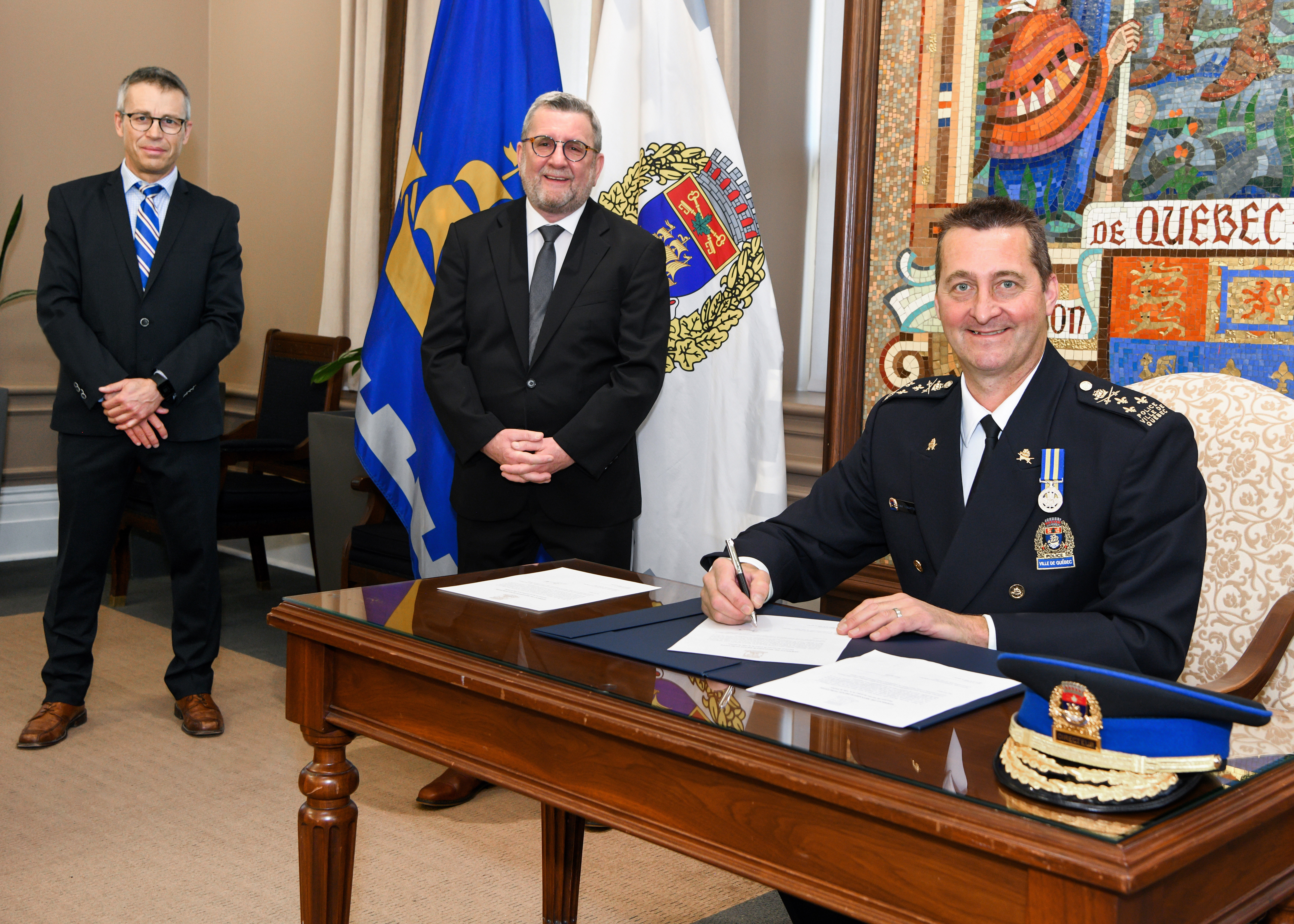 Cérémonie. Le nouveau directeur du Service de police de la Ville de Québec (SPVQ), Denis Turcotte, a été assermenté aujourd’hui dans ses nouvelles fonctions. Sylvain Ouellet, du Service de greffe et des archives de la Ville de Québec, a présidé la cérémonie qui s’est déroulée devant le maire de Québec Régis Labeaume et la famille immédiate du nouveau chef de police.