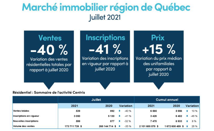 STATISTIQUES. Les statistiques compilées en juillet 2021 démontrent que le marché immobilier de Québec ralentit après une série de records mensuels. Le nombre de transactions a chuté de 50% sur 2020. La tendance amorcée en juin se poursuit, principalement en raison du manque d’inventaire.