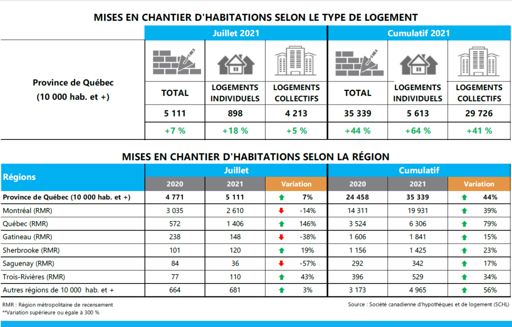 Sur le plan géographique, trois des six régions métropolitaines de recensement (RMR) ont affiché une hausse d’activité par rapport à juillet 2020. La RMR de Québec se démarque nettement, avec une augmentation impressionnante de 146% (1406 mises en chantier). Les RMR de Sherbrooke (120 unités) et de Trois-Rivières (110 unités) ont également emboîté le pas sur le chemin de la croissance, avec des hausses respectives de 19% et de 43%.