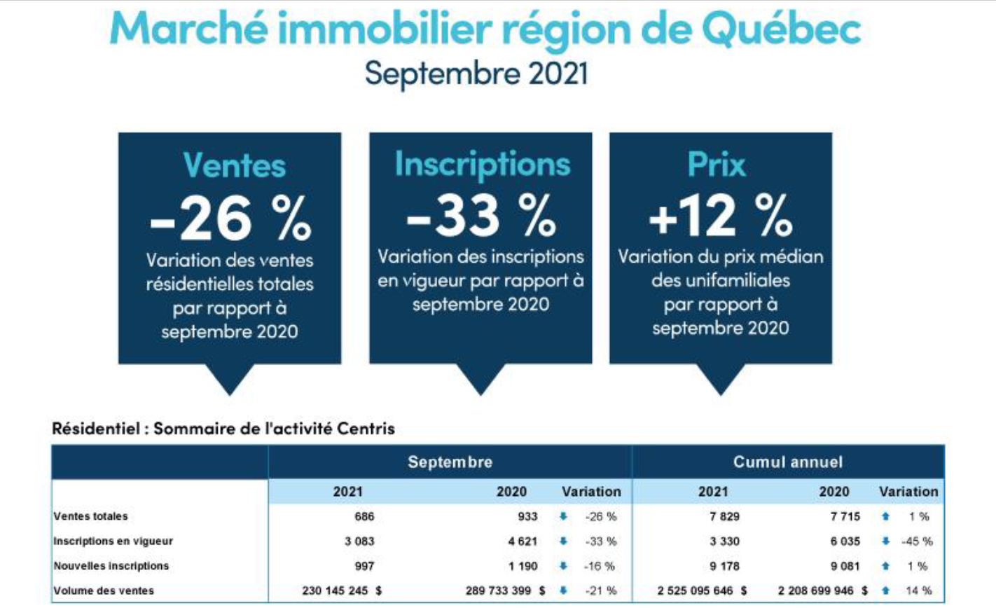 - Reventes totales: pour un quatrième mois consécutif, le nombre de transactions réalisées dans la région de Québec a reculé, à hauteur de 26% en septembre, alors que 686 reventes ont été réalisées par l’entremise du système Centris des courtiers immobiliers. Au cumul des neuf premiers mois de l’année, l’activité transactionnelle a seulement progressé de 1% par rapport à la même période en 2020, avec un total de 7829 reventes.