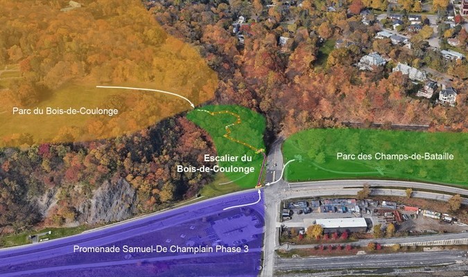 AMÉNAGEMENT. Le chantier de la phase III de la promenade Samuel-De Champlain sera bonifié par l’aménagement d’un nouvel escalier rejoignant deux sites au haut de la falaise. Le lien piéton reliera ainsi le sentier du littoral du fleuve aux parcs du Bois-de-Coulonge et des Champs-de-Bataille. Les travaux débuteront sous peu pour livraison à l’été.
