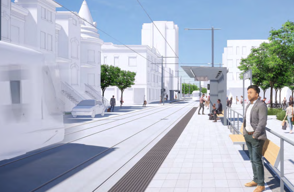 Dans ce contexte, la Ville privilégie une insertion axiale (au centre de la chaussée) du tramway avec voies partagées. Cet aménagement offrira plus d’espace et de confort aux modes actifs (marche et vélo), tout en maintenant les accès locaux et la livraison commerciale. On en profite pour revoir l’aménagement du secteur, ajouter des espaces publics et bonifier la végétation.