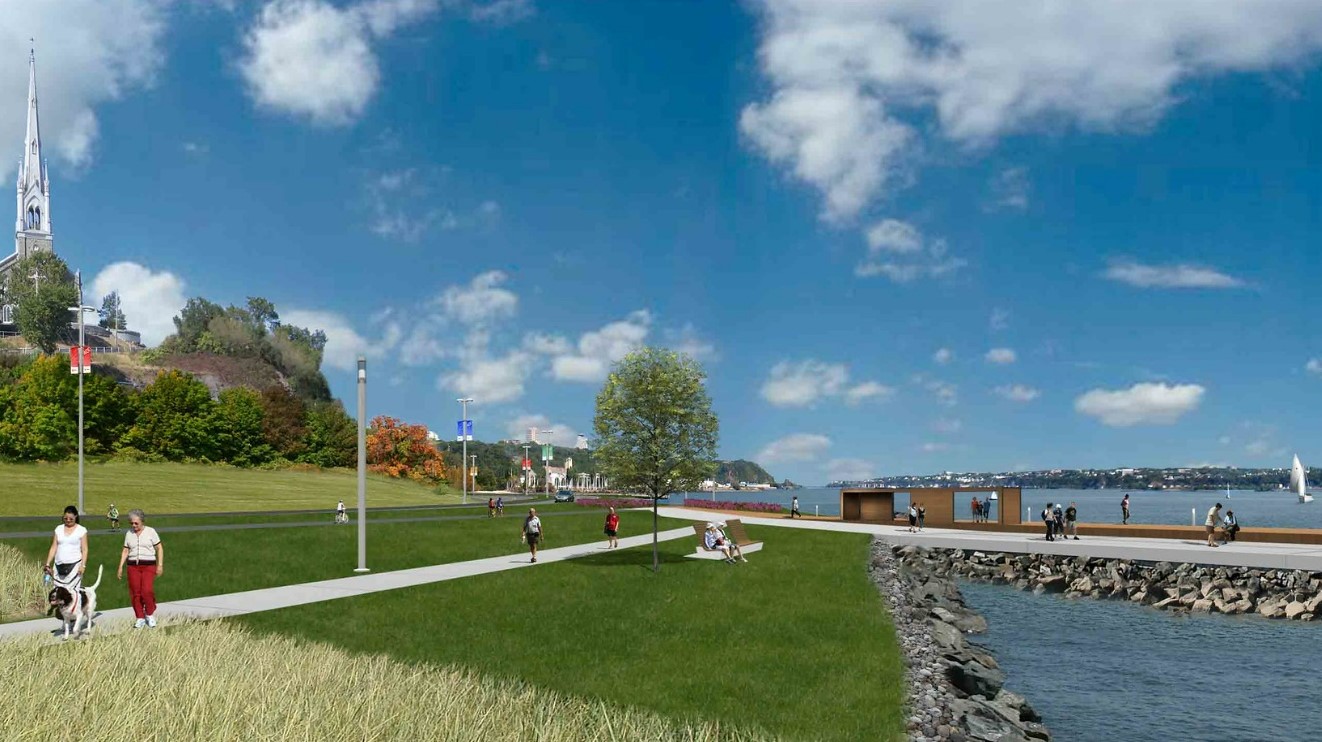 La construction du portique ferroviaire, un ouvrage important qui permettra de déplacer la voie ferroviaire au pied de la falaise, a été complétée avant l’hiver. L’aménagement du pavillon de services, des aires de jeux et de détente et du stationnement sera complété d’ici la fin de l’été dans ce secteur le plus à l’est du projet. Les travaux d’aménagement des berges s’achèveront aussi au cours de l’été et permettront plusieurs accès au fleuve. C’est dans ce secteur que sera érigée l’œuvre d’art public de Klaus Scherübel, qui consiste en un cube en acier poli, incliné et légèrement incrusté dans le sol.