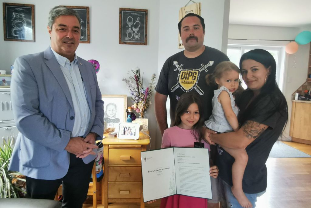 En collaboration avec la famille de Florence Gagné, le député invite la population à soutenir les enfants et leur entourage touchés par cette maladie rare. La pétition e-4021 a pour objectif de désigner le 17 mai de chaque année comme la Journée nationale de sensibilisation au Gliome pontique intrinsèque diffus (GPID).