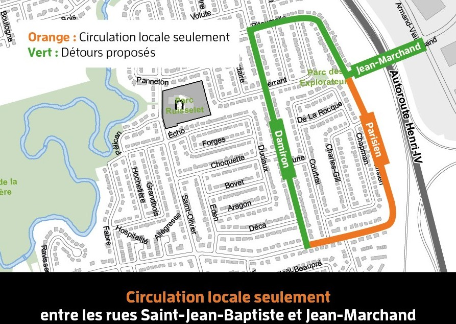 Afin de permettre les travaux, la rue Parisien sera fermée à la circulation automobile. Le trajet de détour empruntera les rues Damion, Ritournelle et Jean-Marchand. Celui-ci sera indiqué par des panneaux.