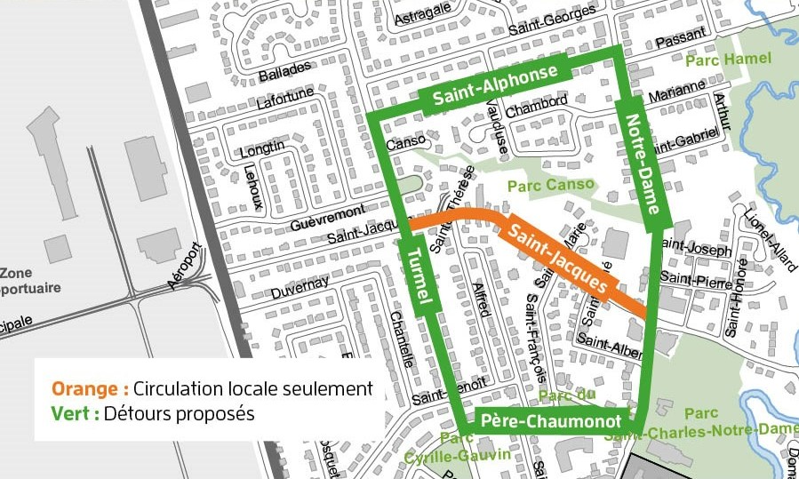 Afin de permettre les travaux, la rue Saint-Jacques sera fermée à la circulation automobile. Le trajet de détour empruntera les rues Saint-Alphonse et Turmel ou Père-Chaumonot et Turmel. Celui-ci sera indiqué par des panneaux.