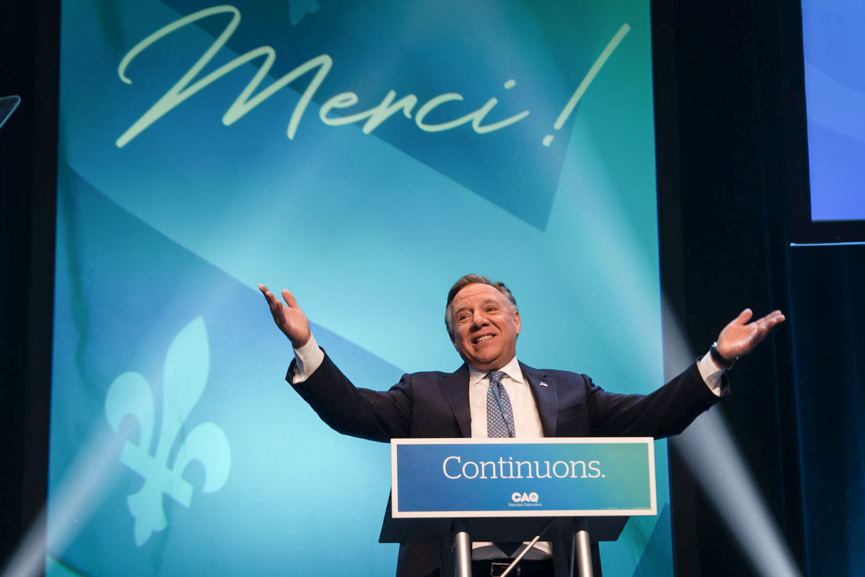 «Les Québécois forment un grand peuple. […] Tous les Québécois de toutes les régions, de tous les âges, de toutes les origines. Je vais être le premier ministre de tous les Québécois», a-t-il lancé, avant de le répéter en anglais.
