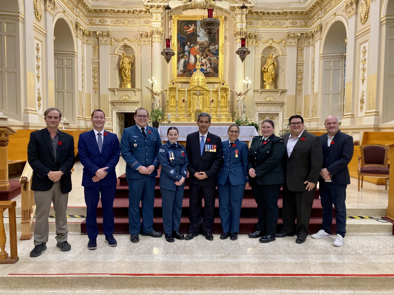 Le député fédéral Pierre Paul-Hus en compagnie de Steeve Guérard de la paroisse Saint-Charles-Borromée, Gabriel Lessard, représentant du bureau du député de Jonatan Julien, les commandants des escadrons de cadets de Charlesbourg (Maxime Legault, Nathalie Gagnon, Jessyca Legault), Sylvain Lévesque, député de Chauveau, et Claude Lavoie, président de l’arrondissement de Charlesbourg.
