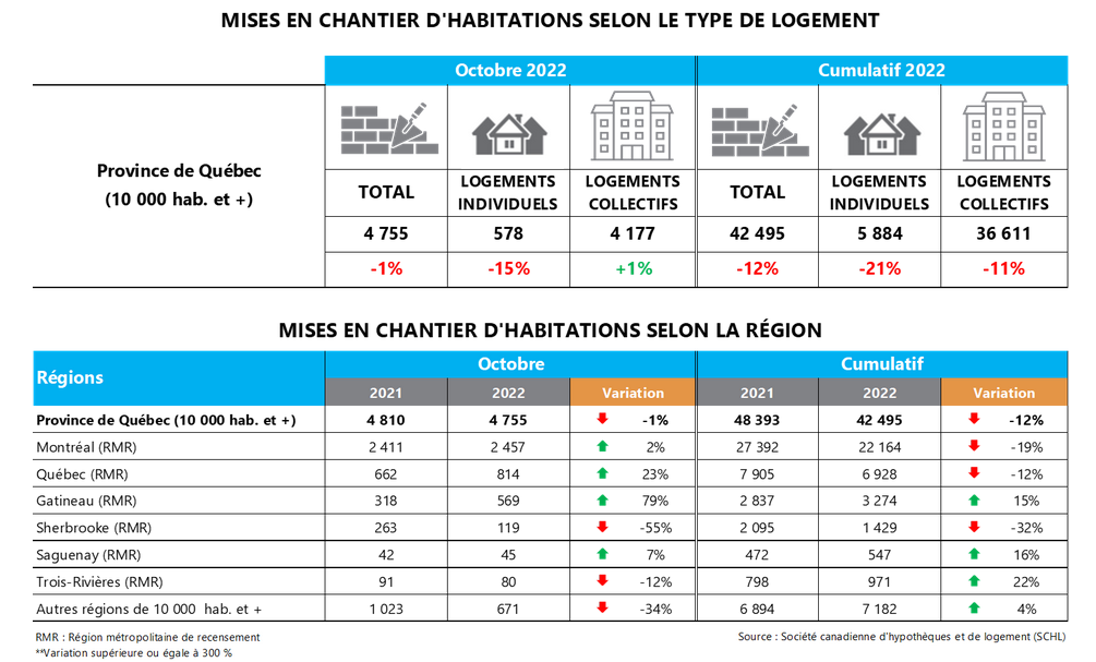«Il s’agit d’une neuvième baisse de l’activité résidentielle au cours des 11 derniers mois. Si l’on regarde le cumul des 10 premiers mois de 2022, on constate une contraction de 12%. L’impact de la hausse des taux d’intérêt sur les mises en chantier est donc bien perceptible. Et cela touche tous les segments de marché», note Paul Cardinal, directeur du Service économique de l’Association des professionnels de la construction et de l’habitation du Québec (APCHQ).