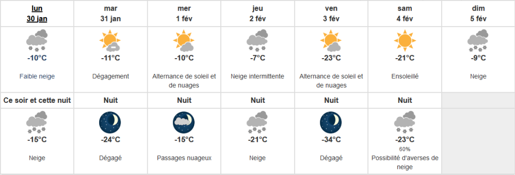 Le mercure va chuter progressivement au cours des prochains jours et c’est durant la fin de semaine prochaine qu’il fera le plus froid. Au plus bas, des températures de -23 et de -21 degrés Celsius sont attendues à Québec, pour les matinées de vendredi et de samedi respectivement. Plus impressionnant encore, le mercure descendra jusqu’à -34 dans la nuit de vendredi à samedi.
