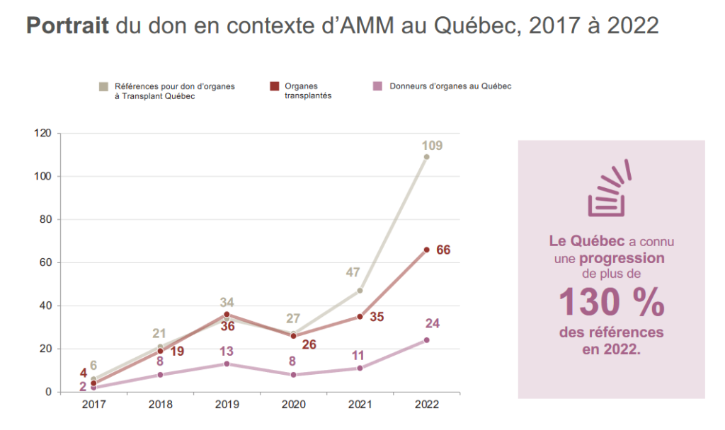 Le Québec se démarque à l’international, en compagnie de la Belgique, des Pays-Bas, du Canada, et récemment de l’Espagne, les seuls pays qui pratiquent le don d’organes en contexte d’AMM. En considérant uniquement les diagnostics prépondérants compatibles avec le don d’organes, il est raisonnable d’estimer le nombre de donneurs potentiels à 10% du nombre d’AMM pratiquées au Québec. Ce qui représenterait possiblement 366 donneurs de plus si on se fie aux chiffres de l’an dernier.