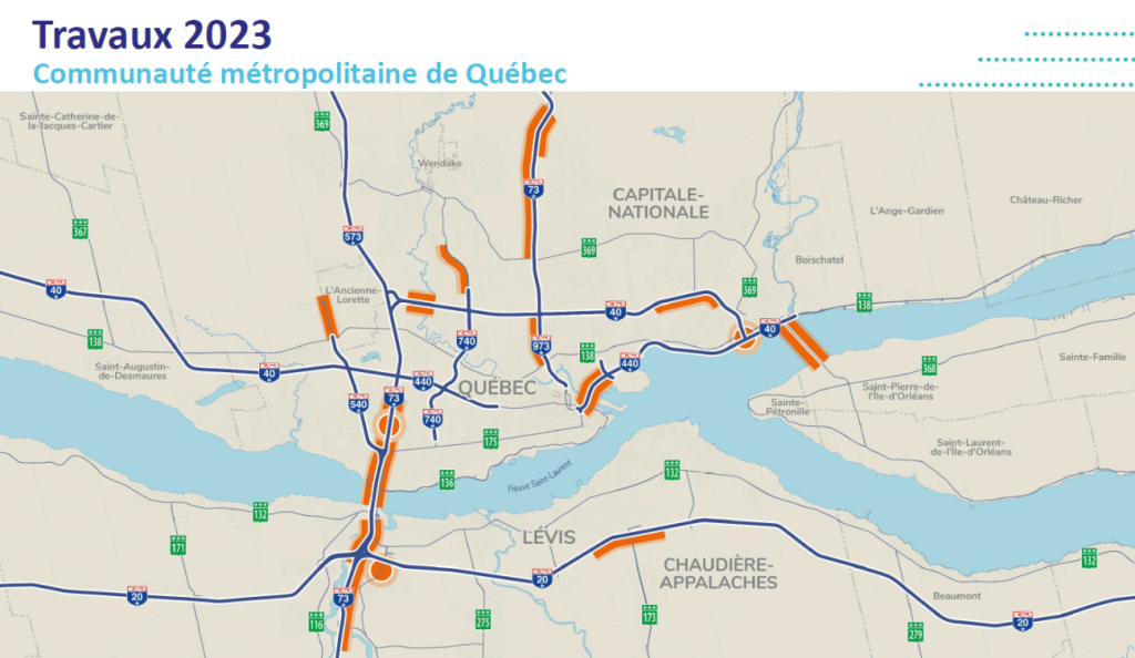 - Plusieurs chantiers se dérouleront dans les échangeurs à la sortie des ponts sur la Rive-Sud, ce qui ralentira les escapades vers Lévis et le Bas-du-Fleuve, ainsi que vers la Beauce et Montréal. Mentionnons, notamment, la réfection de trois ponts d’étagement, l’asphaltage d’une partie de l’autoroute 73 et l’élargissement de l’autoroute 20 à la hauteur de la route Kennedy. Prévoir des réductions de voies, circulation en alternance, fermetures de bretelles et déviations. (mai à novembre)