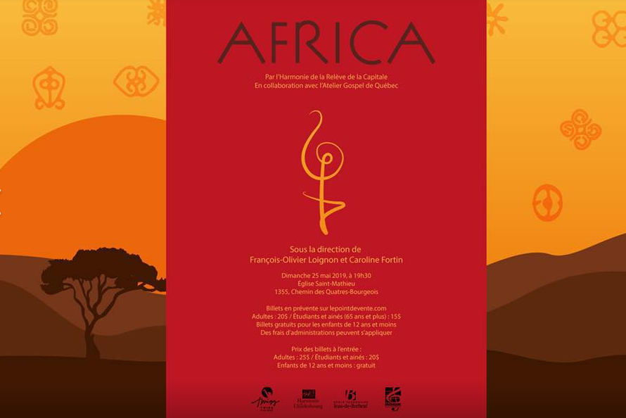 Le Concert Africa aura lieu à l’Église Saint-Mathieu le samedi 25 mai à 19h30. Des œuvres de compositeurs tels que Johan de Meij, John Williams et Kees Vlak seront accompagnés d’une chorale et de danseurs pour quelques pièces. Fondée en janvier 2018, l’Harmonie de la Relève de la Capitale est un ensemble à vents et percussions qui regroupe principalement des jeunes de 16 à 30 ans de la région de Québec désirant continuer à jouer des pièces de niveau plus avancé, même après leurs études secondaires. Sous la direction de François-Olivier Loignon et de Caroline Fortin, l’HRC en est à son quatrième concert, dont le plus récent, le Concert conjoint de Noël, accompagnée par l’Harmonie de Charlesbourg le 16 décembre dernier.
