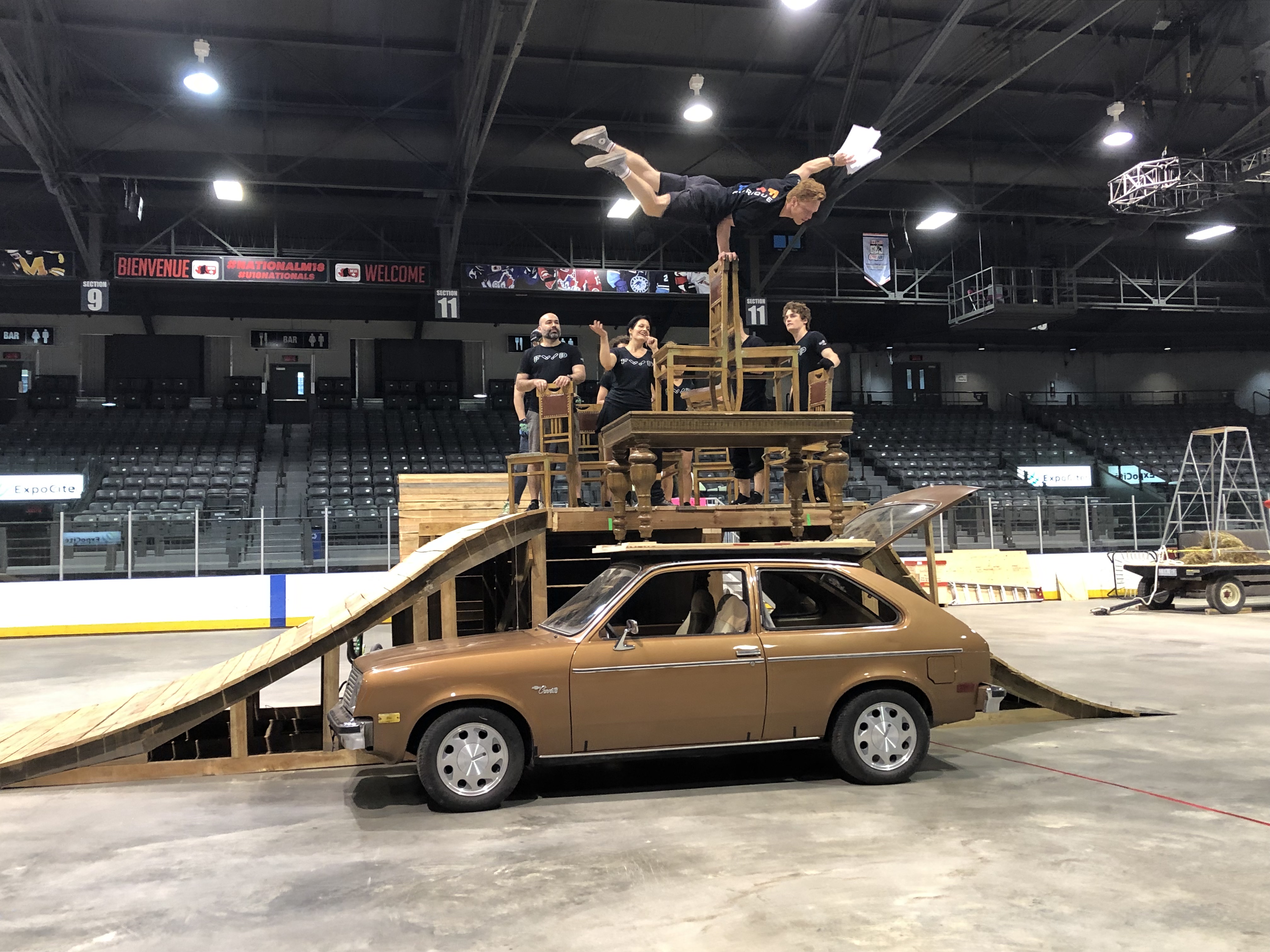 Pendant 55 minutes, les 18 artistes (15 acrobates et trois musiciens du groupe Groenland) performeront sur des scènes mobiles et surélevées dans une configuration bi-frontale (les spectateurs seront de chaque côté). Roue de la mort, véhicules, trampoline avec mur pour les figures, fil de fer feront partie de la mise en scène.