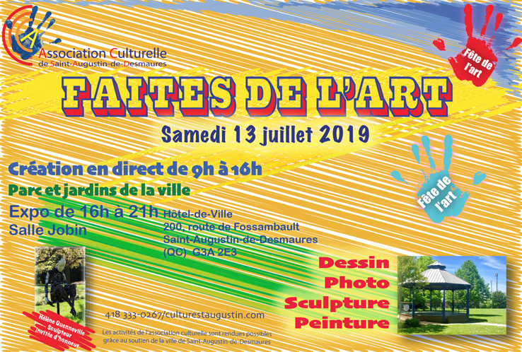 L’Association culturelle de Saint-Augustin et Hélène Quenneville, sculpteure et invitée d’honneur, invitent la population à venir fêter l’art ce samedi 13 juillet. En cas de pluie, les activités se tiendront à la salle Jobin de l’hôtel de ville.