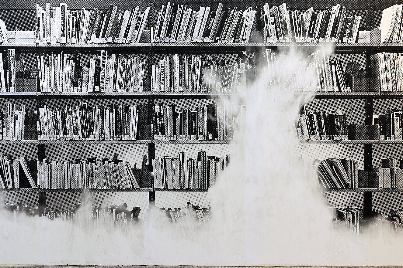 L’œuvre fait également référence à l’artiste italien Claudio Parmiggiani, qui a inventé un procédé baptisé Delocazione, qui consiste à mettre le feu à une installation. Une fois la combustion terminée, la fumée et la suie révèlent des traces en négatif, comme une forme de pochoir. Une de ses œuvres les plus connues est justement les traces laissées par une bibliothèque qui a pris feu.