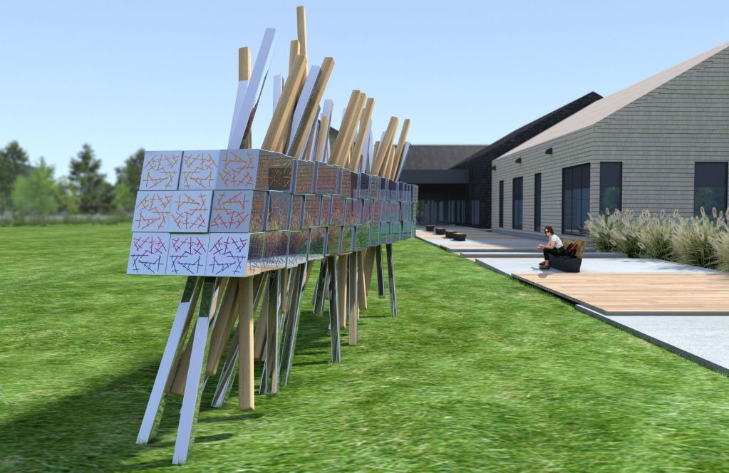 Prévue pour être installée à la base de plein air de Sainte-Foy, l’œuvre de Ludovic Boney sera composée de différentes lignes obliques et de nombreux prismes au fini miroir. D’une longueur de plus de 9 mètres, la création bordera le chemin menant au nouveau pavillon d’accueil. Réalisée au coût de 70 854$, l’installation sera complétée au cours du mois de septembre.