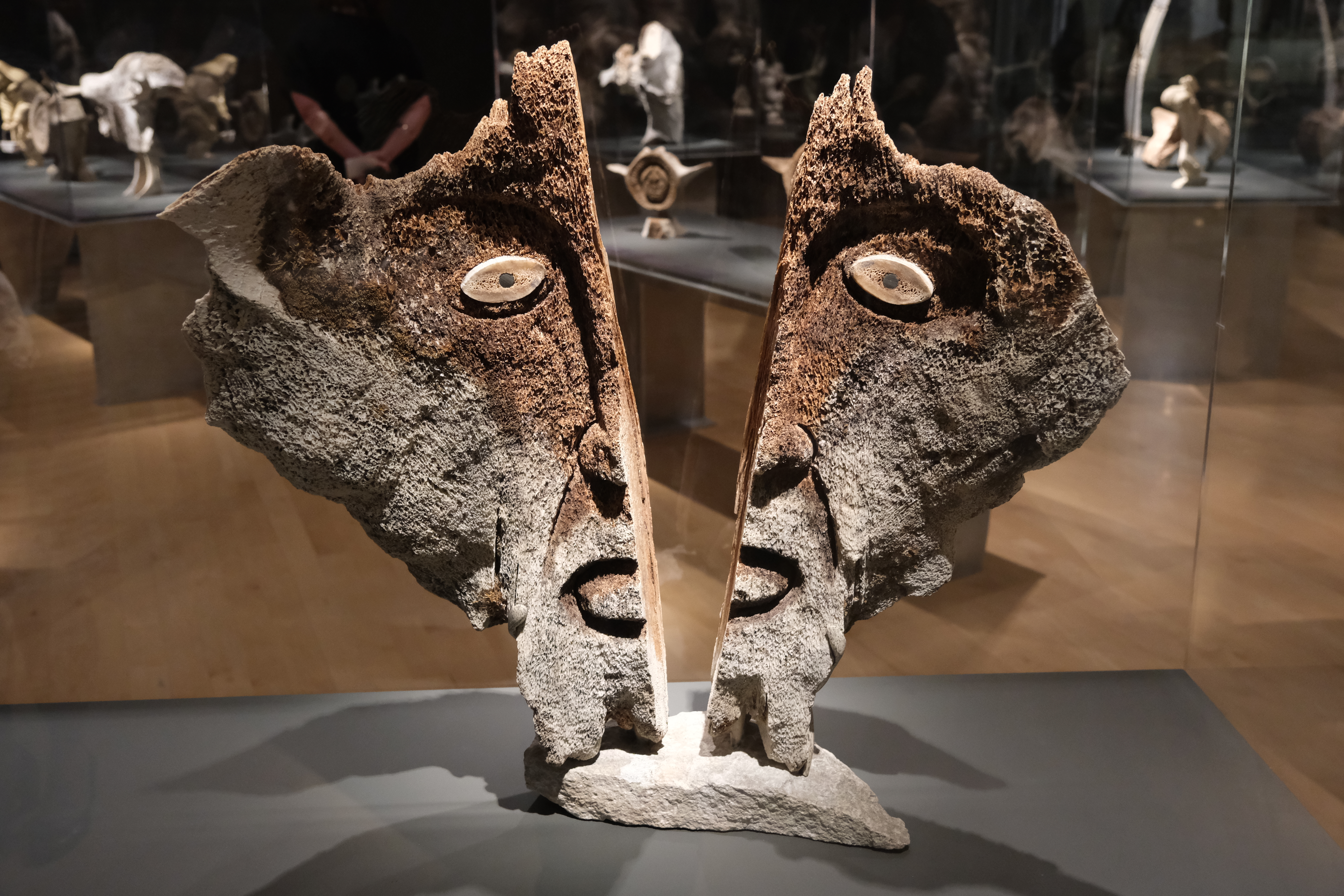 À travers un savant amalgame entre les os de baleine et les bois de caribou, on découvre le visage déchiré d’un chaman consterné par les impacts dévastateurs du passage de sa communauté à un mode de vie sédentaire. Cette sculpture phare du corpus illustre avec justesse et sagesse la manière dont les autorités gouvernementales ont forcé les Inuits à adopter le style de vie des populations du Sud en les arrachant à leurs traditions.