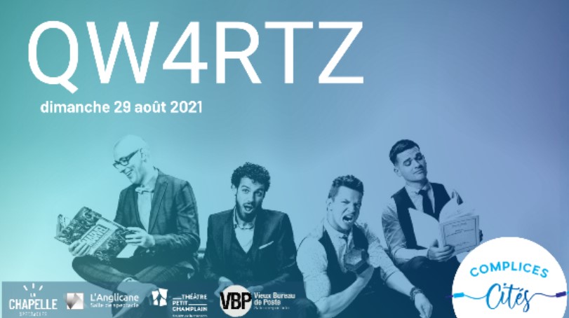 Le dimanche 29 août prochain, dans le cadre de la première tournée ComplicesCités, quelques dizaines de spectateurs tirés au sort par quatre diffuseurs de Québec et Lévis auront le privilège d’assister, dans des lieux inusités et tenus secrets, à l’une des quatre prestations offertes par l’ensemble a cappella QW4RTZ. L’initiative vise à faire valoir la solidarité des diffuseurs dans le contexte pandémique qui ébranle notamment le secteur culturel.