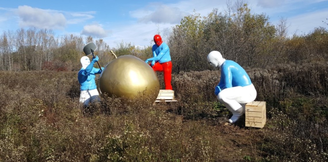 Est-ce que les personnages enterrent la pomme ou au contraire la déterrent? Libre à chacun d’interpréter comme il le souhaite cette énigme visuelle. Comme à son habitude, le duo a travaillé sur les jeux d’échelles (le spectateur devient lui-même un schtroumpf des schtroumpfs puisqu’il est beaucoup plus petit que les personnages) et sur les couleurs. «On a utilisé des logiciels 3D pour créer et ce sont des robots sculpteurs, par soustraction de matière qui ont fabriqué l’œuvre», explique Pierre Sasseville. La pomme est en fibre de verre et les personnages sont plastifiés à chaud.