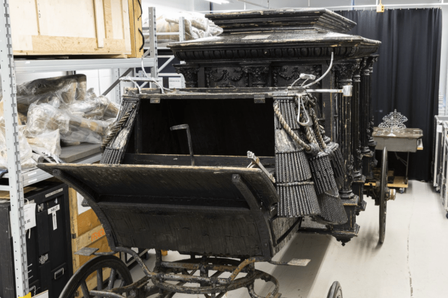 Parmi les artefacts, on y retrouve des objets funéraires appartenant à la famille de Cécile et Robert Lépine. Ils constituent un ensemble relativement complet du patrimoine funéraire du Québec entre 1845 et 1975, notamment du matériel d’embaumement, des éléments nécessaires pour l’exposition des corps à domicile, des corbillards, des vêtements d’équipage, des attelages, des harnais et accessoires pour chevaux.
