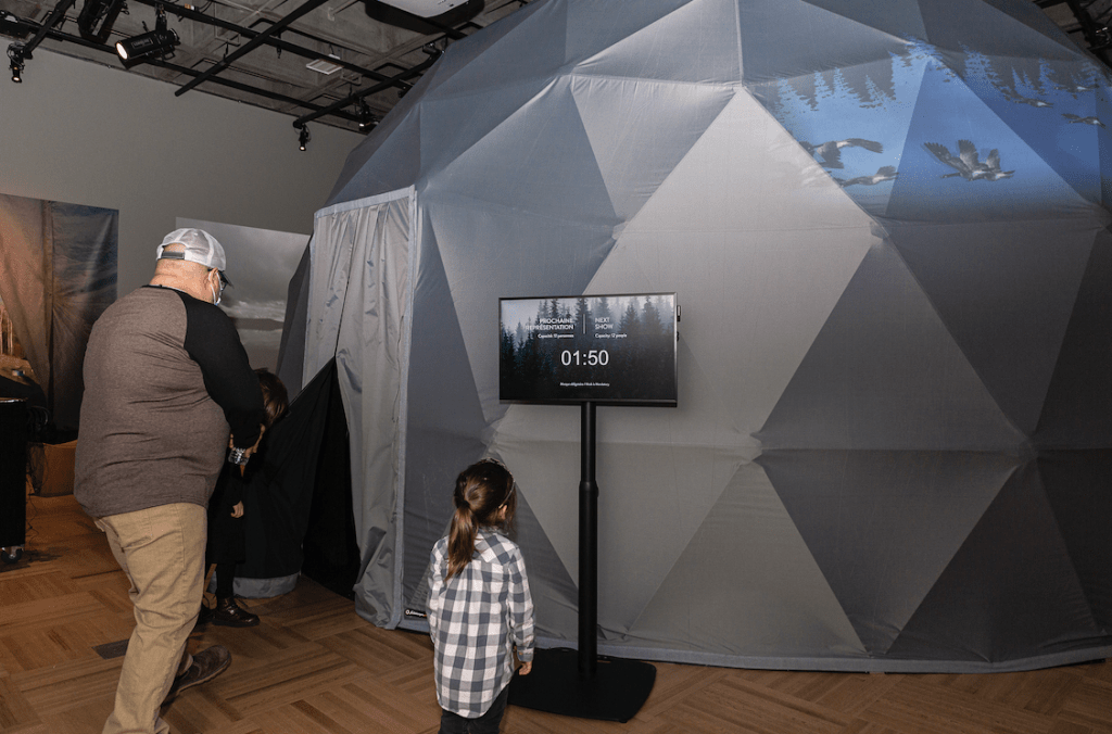 Jusqu’au 5 septembre prochain, les visiteurs du Musée sont invités à entrer dans un dôme de sept mètres de diamètre pour qu’ils s’imprègnent de la tradition crie durant les célébrations du Goose Break. Parmi les traditions projetées en images à 360 degrés sur les murs du dôme, on y découvre l’organisation des chasseurs qui traquant la bernache et la préparation des prises. Quant aux petits enfants nés dans l’année, on les prépare dans le mîkowâhp (le tipi) pour la cérémonie des premiers pas.