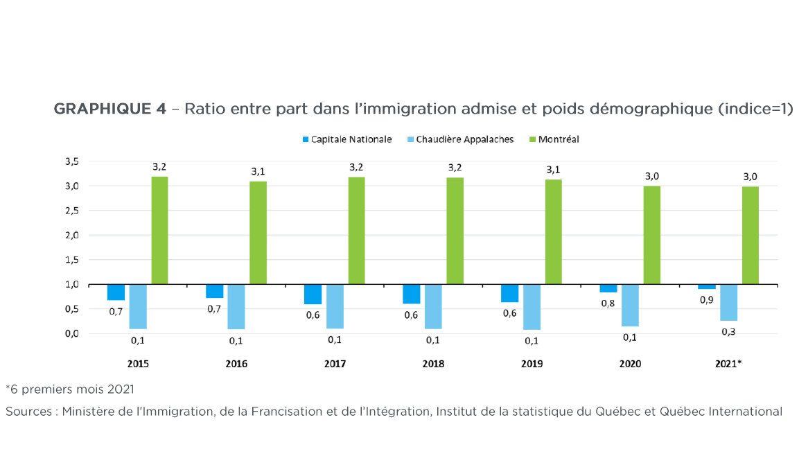 3) La régionalisation de l’immigration est un enjeu au Québec et particulièrement dans les régions administratives de la Capitale et de Chaudière-Appalaches comme le montre l’analyse de Québec International. Bien qu’on constate une amélioration de la régionalisation dans les dernières années, il faudra poursuivre les efforts afin que ces deux régions bénéficient davantage du levier économique de l’immigration.