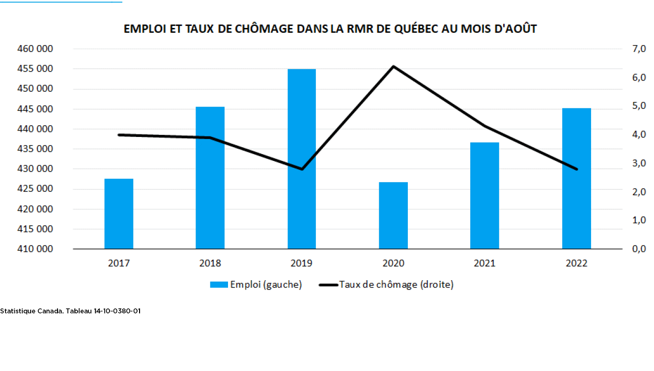 STATISTIQUES – La bonne tenue de l’emploi à Québec entre août 2021 et août 2022 (+2%) laisse présager que l’économie de la région est dans une posture avantageuse pour faire face à cette période d’inflation. Cette situation avantageuse fait toutefois craindre un revers négatif, considérant que la pénurie de main-d’œuvre sévit à tous les niveaux et dans toutes les sphères de l’économie régionale.