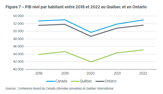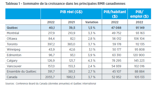 «Il s’agit d’un niveau plus faible qu’ailleurs, alors que dans l’ensemble du Canada, les autres régions se sont situées aux alentours de 1,5% de croissance en moyenne. Pour sa part, Montréal a connu la plus grande croissance du PIB par habitant avec 2,5%», note l’équipe des études économiques de Québec International.
