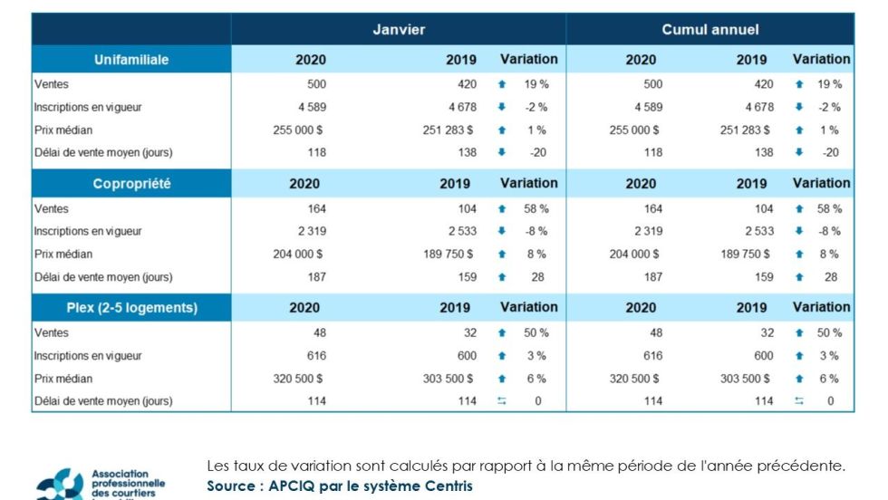 STATISTIQUES. Le premier bilan mensuel de l’Association professionnelle des courtiers immobiliers du Québec (APCIQ) révèle que l’année 2020 part sur de bonnes bases à Québec. Un total de 713 reventes