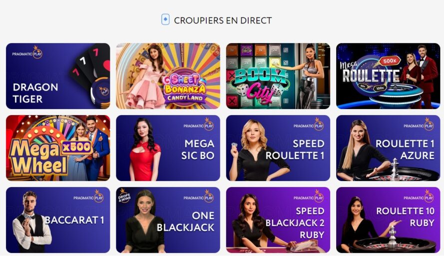 Sur la page principale Zaza casino, vous pouvez accéder en un seul clic à la catégorie « Croupiers en direct ». Celle-ci compte un nombre important de tables en Live. Cela n’est possible que grâce aux studios de Pragmatic play, l’un des éditeurs présents sur cette plateforme. La liste des jeux en direct disponibles sur ce casino est longue, voici toutefois quelques-uns d’entre eux :